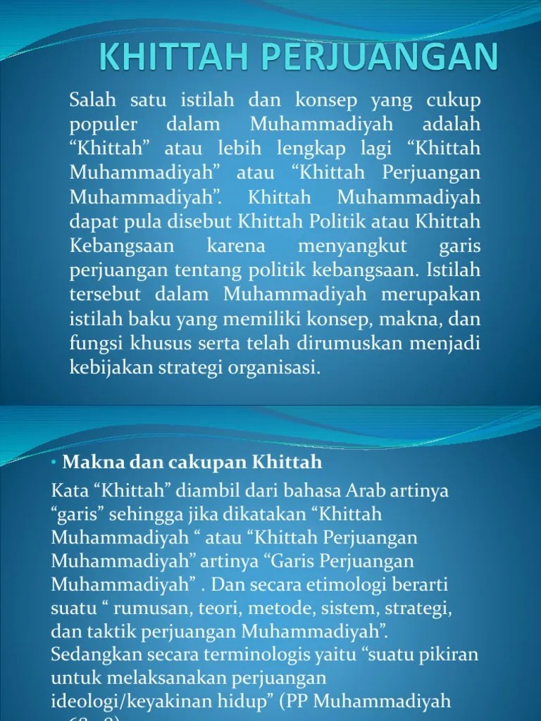Khittah artinya garis besar perjuangan. Khittah perjuangan muhammadiyah berfungsi sebagai landasan berpikir bagi semua pimpinan dan anggota juga menjadi landasan setiap amal usaha muhammadiyah. Maksud dan tujuan khittah perjuangan muhammadiyah. Fungsi dan arahan khittah perjuangan muhammadiyah. 8) fungsi khittah dari penyusunan khittah yang berkembang sejak 1956 hingga .
